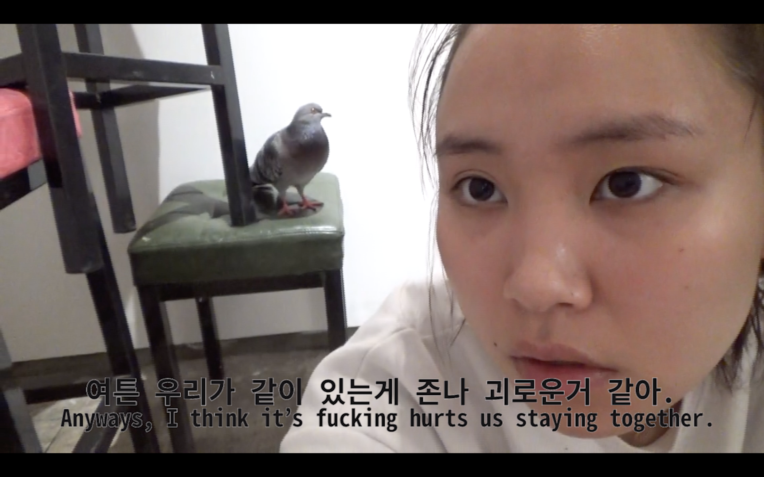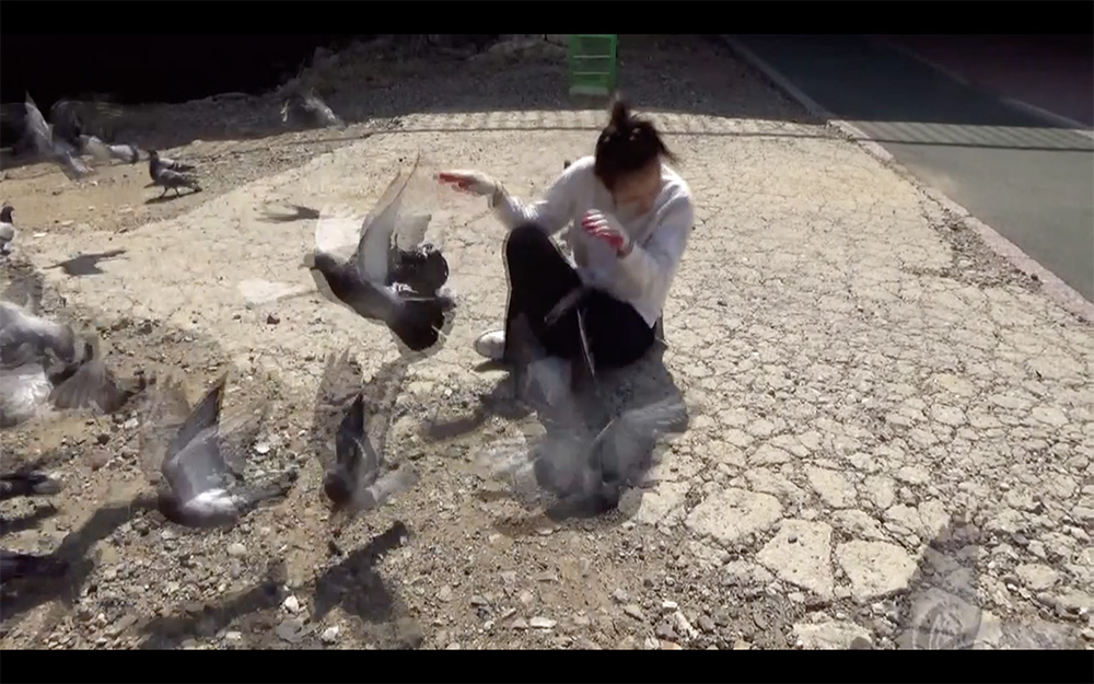 작업을 위해 비둘기를 포획하고자 나선 작가는 비둘기가 생각보다 쉽게 잡히는 동물이 아니라는 점을 깨닫고 좌절한다. 비둘기는… 그러니까 길고양이와는 다르므로, 떼로 모여서 바글거리고 그 후추색 군집은 부담스럽다. 그 때문에 작가는 비둘기를 초대하거나 달래가며 꾀는 것이 아니라, 장갑을 끼고, 먹을 만한 것을 던져주며, 마치 사냥꾼과 같은 태도로, 노릴 수밖에 없다. 하지만 김아람은 마치 사냥꾼과 같이 강인한 사람은 아니므로, 계속해서 독백한다. 내가 이걸 할 수 있을까? 할 수 있다고 한 번만 말해줘. 이것은 윤리적 딜레마 앞에서 고민하는 사람의 태도라기보다는, 미적 해프닝을 일으키기에 앞서 주저하는 사람의 태도처럼 보이므로 희극적이다.