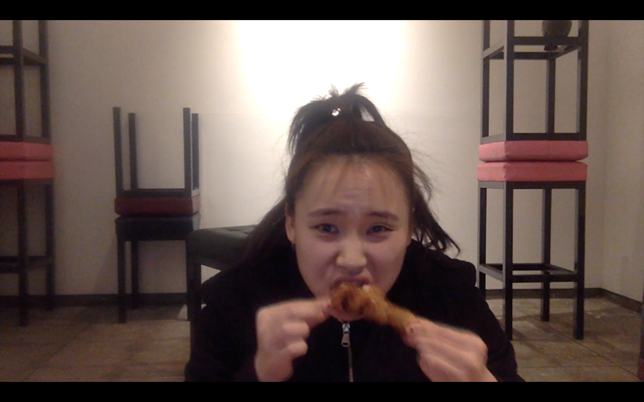 그렇지만 이런 양가성은 이미 전시의 주제 중 하나다. 나아가, 김아람은 기록된 영상에서, 내내 신기할 정도로 진솔하게, 혹은 투명하게 행동한다. 작가는 ‘무엇으로서의 예술가’를 위한 제스처를 취하는 대신, 자신을 그냥 김아람으로 내버려 두는 것 같다. 그렇기 때문에 영상의 어떤 내러티브는 자연히 희극적인 것이 된다. 그건 이를테면 다음과 같은 부분이다.